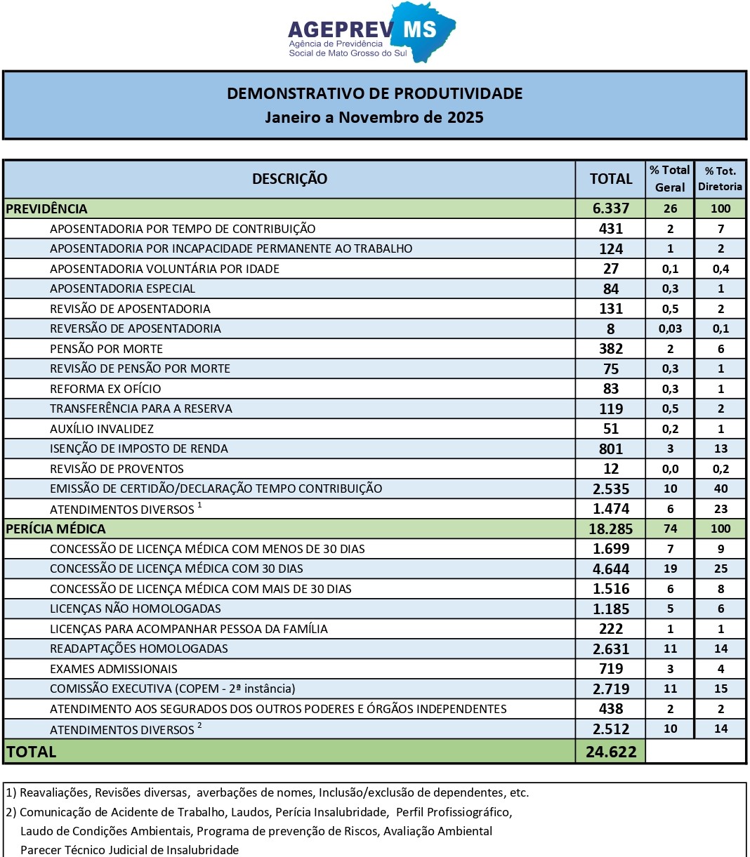 A Agência de Previdência Social de Mato Grosso do Sul (Ageprev) divulga nesta quinta-feira (04/12/2025) sua produtividade, que lista os pedidos de aposentadoria, pensão, reforma ex ofício, transferência para reserva, auxílio invalidez, isenção de imposto de renda, reversão de aposentadoria, além de revisão de aposentadoria, pensão e proventos, bem como a emissão de certidões e declarações de tempo de contribuição, todos relacionados aos servidores públicos estaduais.