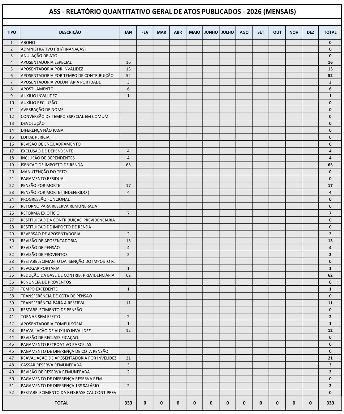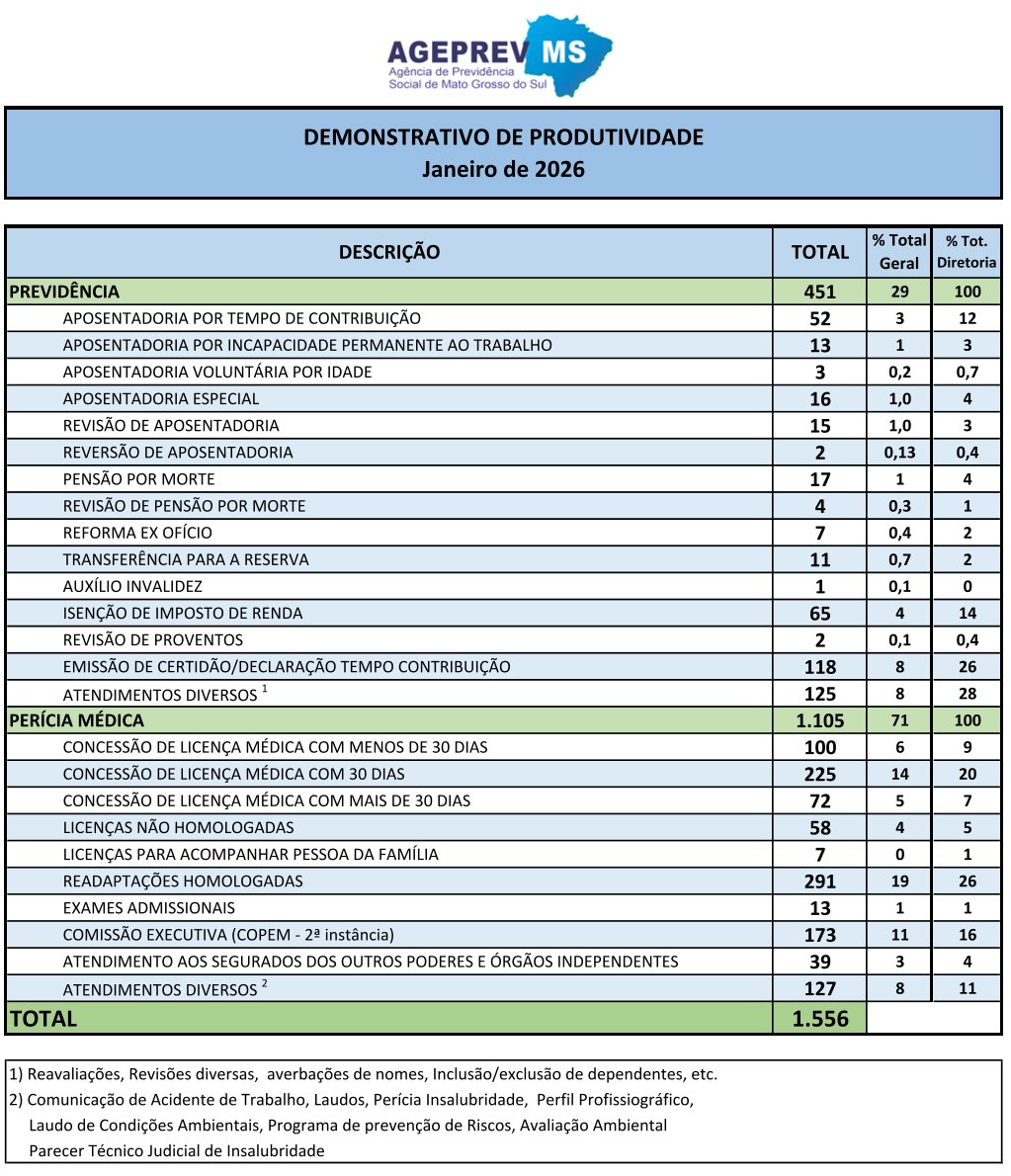 A Agência de Previdência Social de Mato Grosso do Sul (Ageprev) divulga nesta quinta-feira (05/02/2026) sua produtividade, que lista os pedidos de aposentadoria, pensão, reforma ex ofício, transferência para reserva, auxílio invalidez, isenção de imposto de renda, reversão de aposentadoria, além de revisão de aposentadoria, pensão e proventos, bem como a emissão de certidões e declarações de tempo de contribuição, todos relacionados aos servidores públicos estaduais.